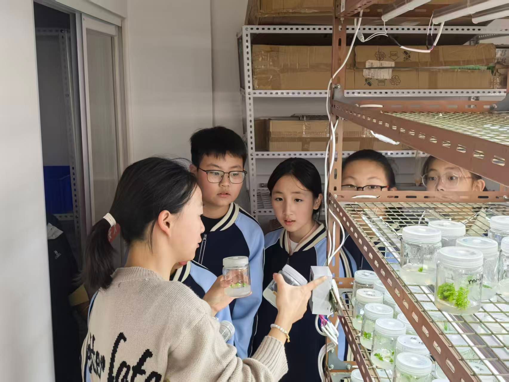 随后,同学们走进了生态学、生物学研究实验平台和陕西省黄土高原资源植物研究与利用重点实验室。在这里,他们感受到了严谨而前沿的科研氛围,各类先进的仪器设备让同学们对高水平的科学研究有了初步的感性认识。在组培室里,一株株茁壮生长的组培苗引起了大家的极大好奇。相关负责教师用浅显易懂的语言,为同学们讲解了植物组织培养的原理、流程及其在农业生产和生态保护中的重要意义,让同学们对现代生物技术有了更加直观的理解。整个研学过程中,学院专业教师化身科普讲解员,用专业的学识和生动的讲解,为附中学子们答疑解惑,将复杂的科学知识转化为一次有趣的探索体验。现场气氛热烈,互动频繁。