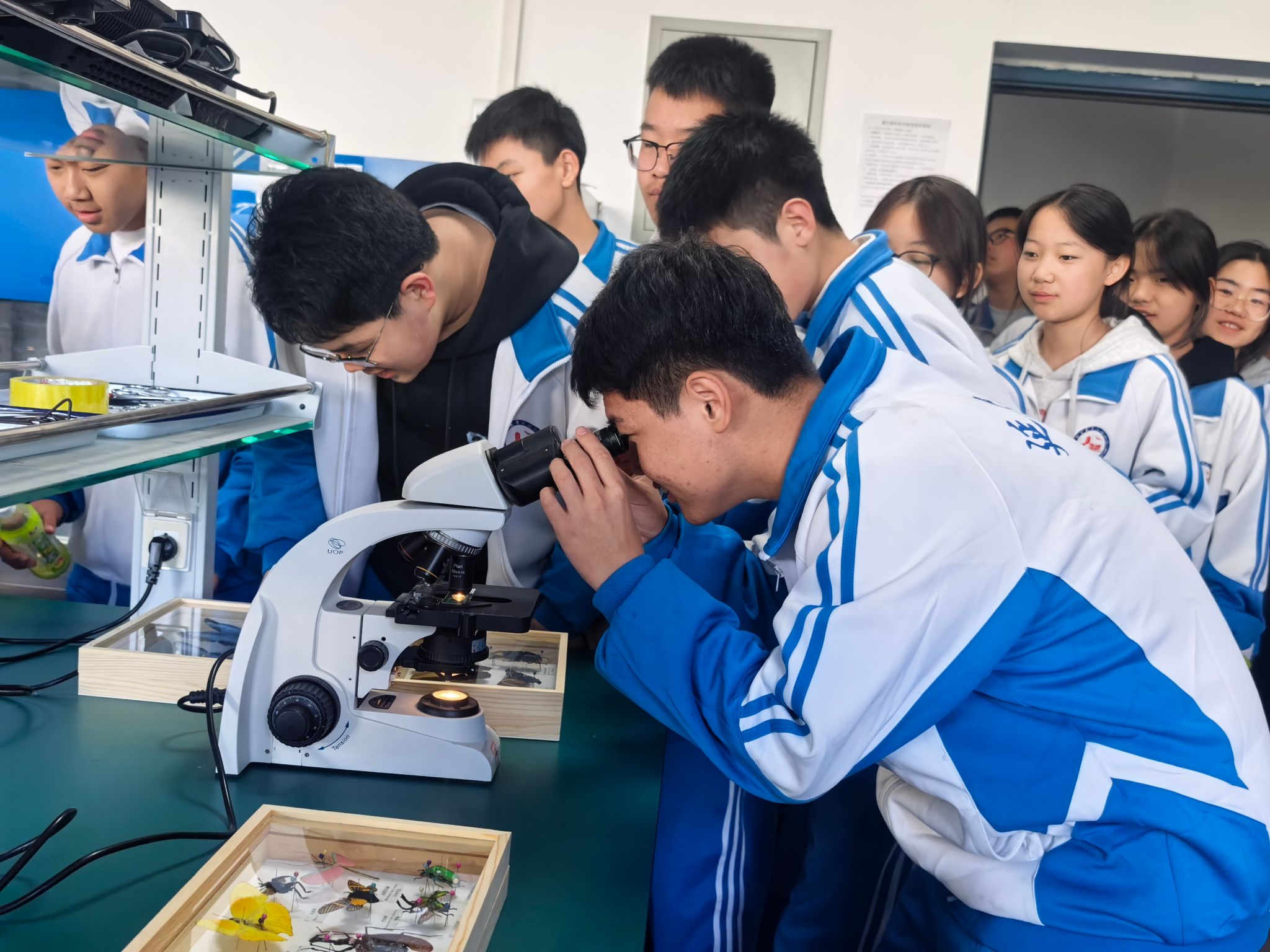 在学院微生物实验室里,平日在课本上看到的细菌、真菌等微生物,此刻在显微镜下清晰地呈现出它们的真实形态。同学们在学院教师和研究生的耐心指导下,亲手操作显微镜,观察玻片标本,从模糊到清晰,从抽象到具体,为附中学子们打开了一扇通往微观与宏观生命世界的窗口。在昆虫与菌物标本展示区,色彩斑斓的蝴蝶、形态各异的甲虫吸引了孩子们不时驻足观看;各类食用菌标本向同学们展示了各类大型真菌的形态和作用。大家围在展台前,仔细辨认,踊跃提问,通过生动的实物标本,加深了对生物多样性的理解。