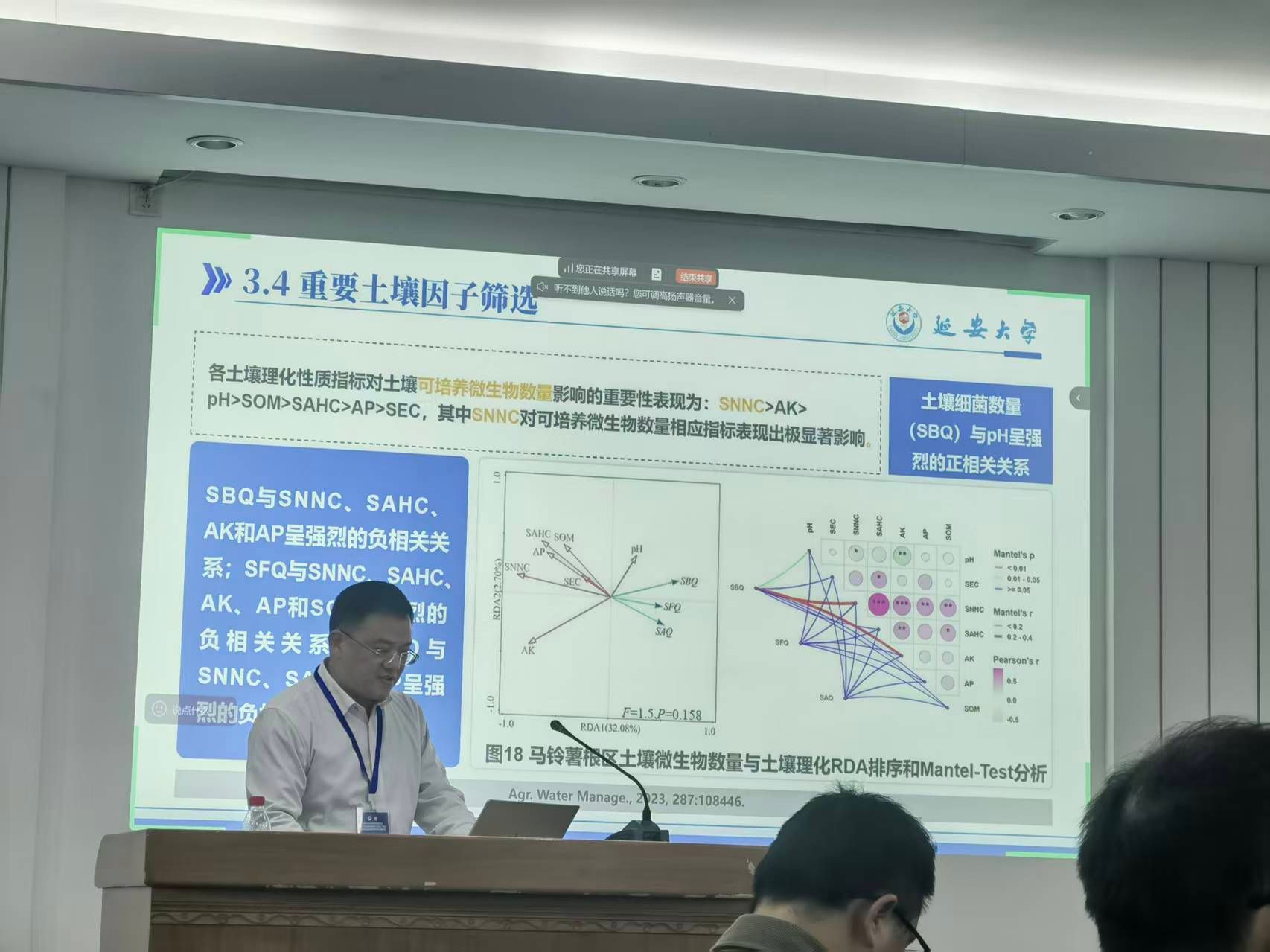王秀康在报告中系统介绍了其承担的科学基金项目在研究内容、创新思路、关键进展及科研体会等方面的成果。该研究围绕马铃薯水肥高效利用与农田土壤质量提升,探讨了在精准配施条件下水肥协同调控对作物产量品质及土壤环境的协同机制,为西北旱区农业节水增效与绿色生产提供了理论依据和技术路径。报告引发了与会学者的广泛关注与热烈讨论,展现了延安大学在农业水利与资源环境交叉领域的科研实力与创新活力。