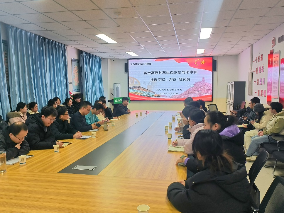 2025年12月24日上午,我校特聘教授、西北农林科技大学邓蕾研究员应邀为生态学前沿系列讲座作专题学术报告,题为“黄土高原林草生态恢复与碳中和”。报告在杨家岭校区特立楼二楼会议室举行,由生态学学科带头人王秀康教授主持,生命科学学院等院系60余名师生参与交流。
