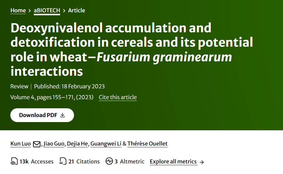 (脱氧雪腐镰刀菌烯醇(Deoxynivalenol,DON)是小麦赤霉病的重要致病菌—禾谷镰孢菌在侵染作物期间所分泌的一种重要的霉菌毒素,既可作为一种毒力因子,加速作物组织的坏死,还可毒污谷物籽粒,进而给谷物的安全生产带来严峻挑战。)如果篇幅所限,可以删除加粗部分。该论文深入剖析病原真菌致害所引起宿主体内大量累积霉菌毒素脱氧雪腐镰刀菌烯醇的分子网络,以及宿主应对该毒害而发展的解毒策略。这对于改良作物品种的抗病性与稳定作物的产量和品质具有重要意义。该研究成果于2023年发表《aBIOTECH》期刊第4卷第3期。